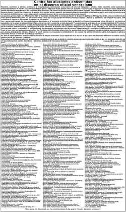 El Ministerio de Información y Comunicación de la República Bolivariana de Venezuela responde a un remitido de prensa, firmado por un grupo de ciudadanos que se presentan como " escritores y artistas, profesores e investigadores" para acusar de "antisemita" al Presidente Hugo Chávez y al Gobierno Bolivariano.